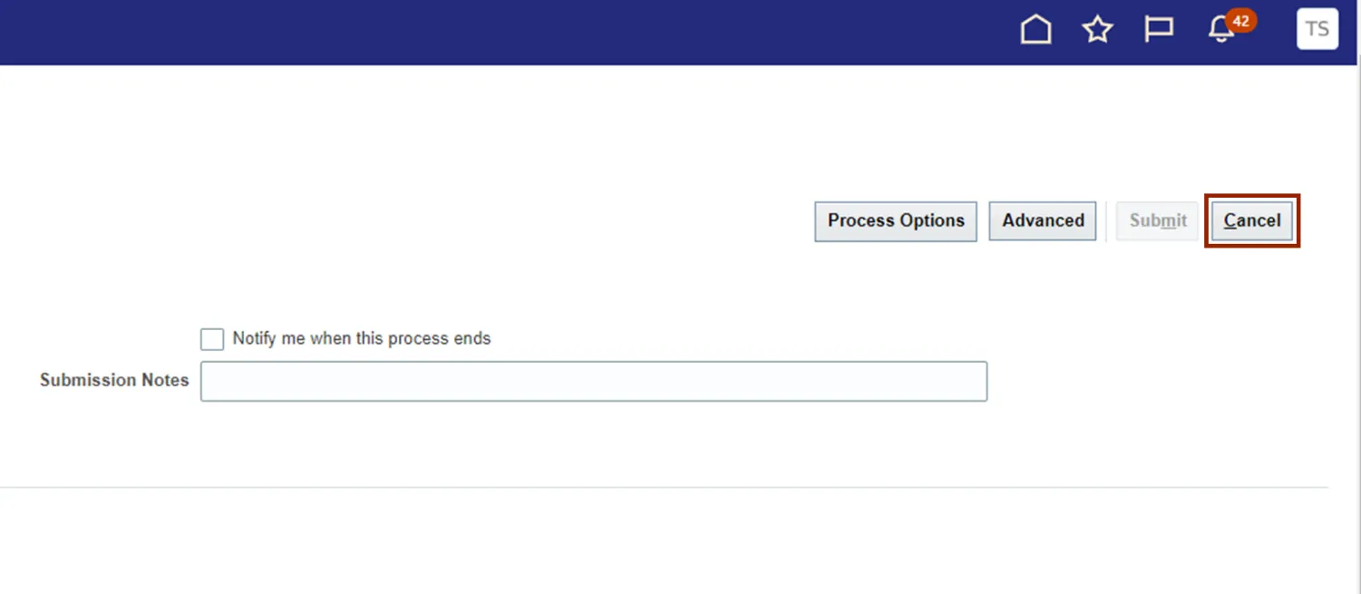 Step 6. On the Submit Request page, click the Cancel button. The Invoice Approval workflow is initiated and the Invoices are submitted.