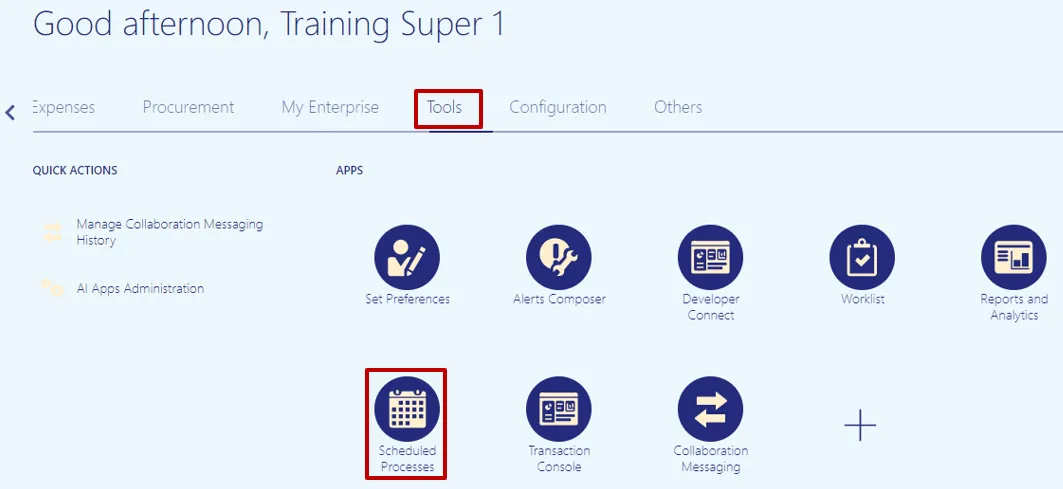 Step 8. Navigate to Tools application and click on Scheduled Processes. This is the step to find out the status of the Validate Invoice program.