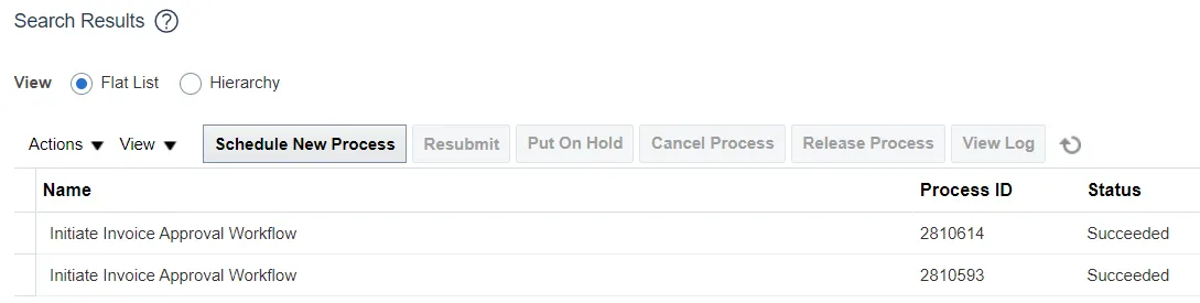 Step 10. Click the Search arrow and enter the search criteria. You can use several criteria like Name, Process ID or the Submission Time to inquire for the process status. The process name to search for is – Initiate Invoice Approval Workflow, click on Search button.