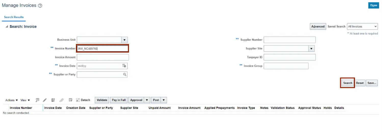 Step 4. The Manage Invoices page opens. On the Search: Invoice section, enter the required fields. Click the Search button.