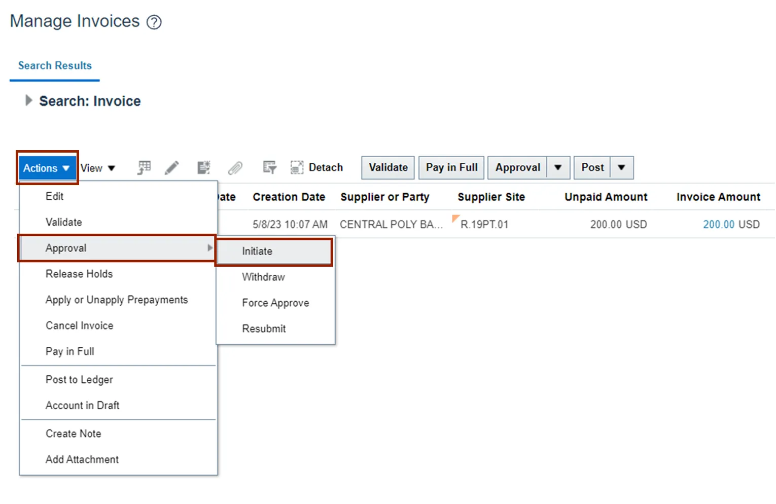 Initiate Approval for single Invoice