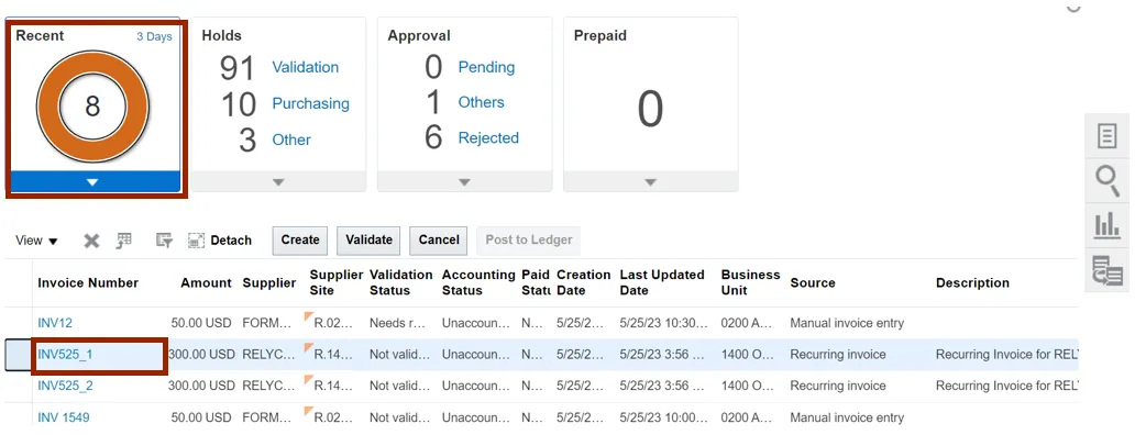 Step 14.    Navigate to NCFS Login >> Payables >> Invoices. The Invoices dashboard opens. Click the Recent info tile. Two recurring invoices, INV525_1 and INV525_2, are generated.