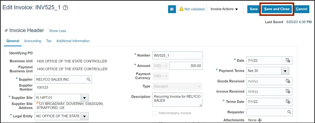 Step 16.    More information on the invoice is displayed. Click the Save and Close button. The updates are saved. You are now redirected to the Invoices dashboard.