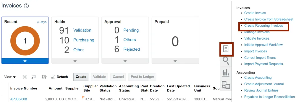 Click the Invoice Number link to validate the recurring invoices.