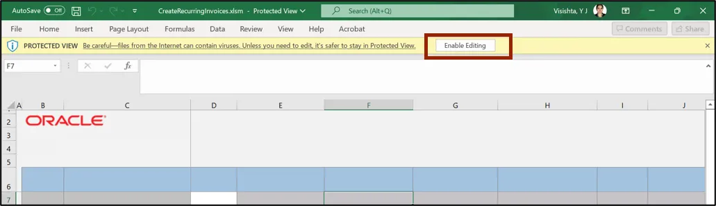 Step 4.    On the CreateRecurringInvoices.xlsm file, click the Enable Editing button.