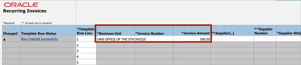 Step 7.    The CreateRecurringInvoices.xlsm file displays a table to enter the invoice details. Enter the invoice details in all the mandatory fields (marked with *).