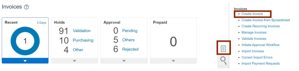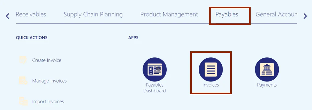 Step 2. On the Home page, click the Payables tab and click the Invoices app.