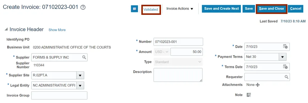 Step 11. The invoice is Validated. Click the Save and Close button. The changes are saved.