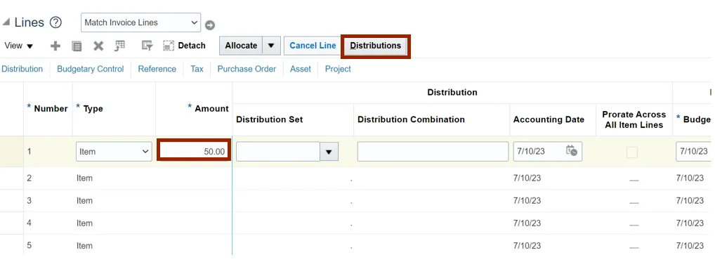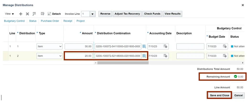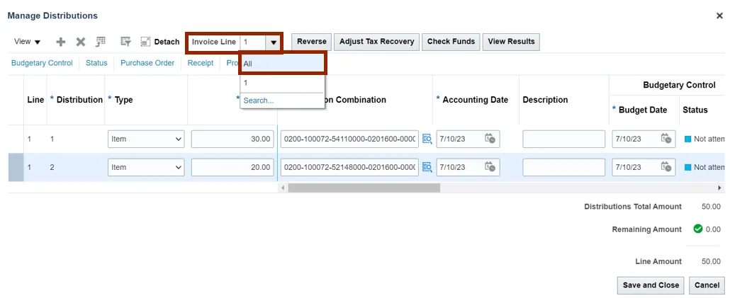 Note: In this example, we have added two distributions for one Invoice Line.