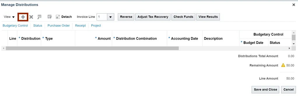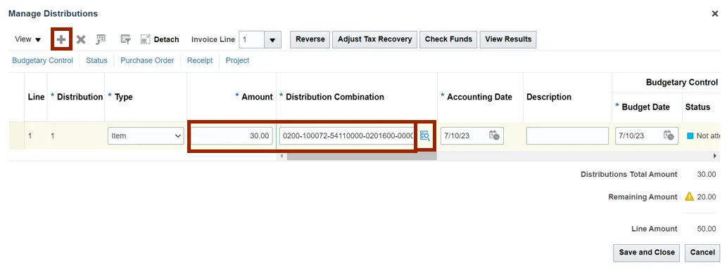 Step 7. Enter the required Amount and Distribution Combination. Click the Plus icon to add another distribution.