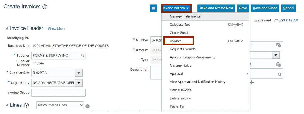 Step 10. You are redirected to the Create Invoice page. Click the Invoice Actions drop-down choice list and select Validate option.