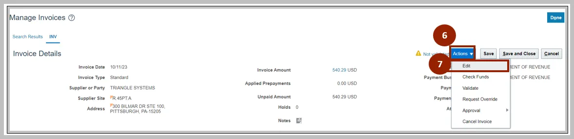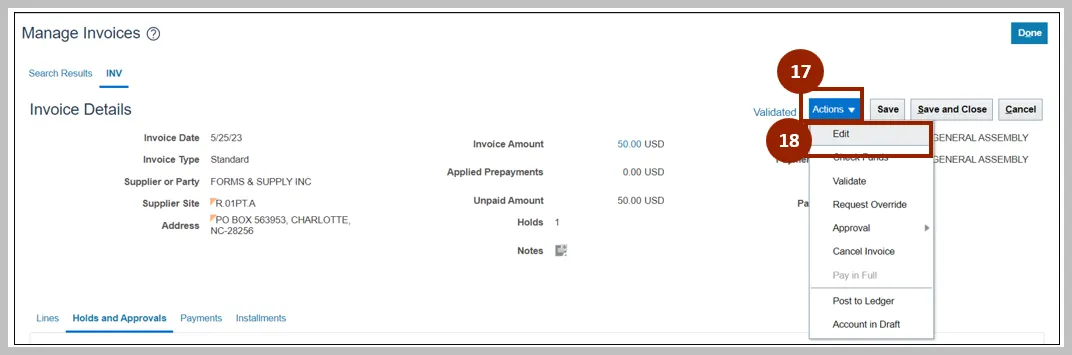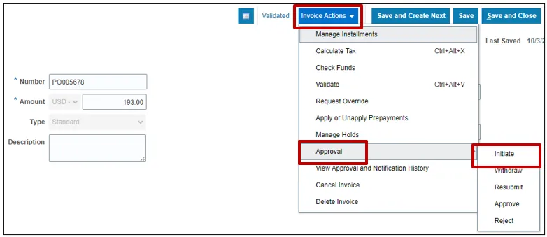 Step 14. Once the Invoice is Validated, click the Invoice Action drop-down button. Select Approval and Initiate from the Invoice Action drop-down choice list.