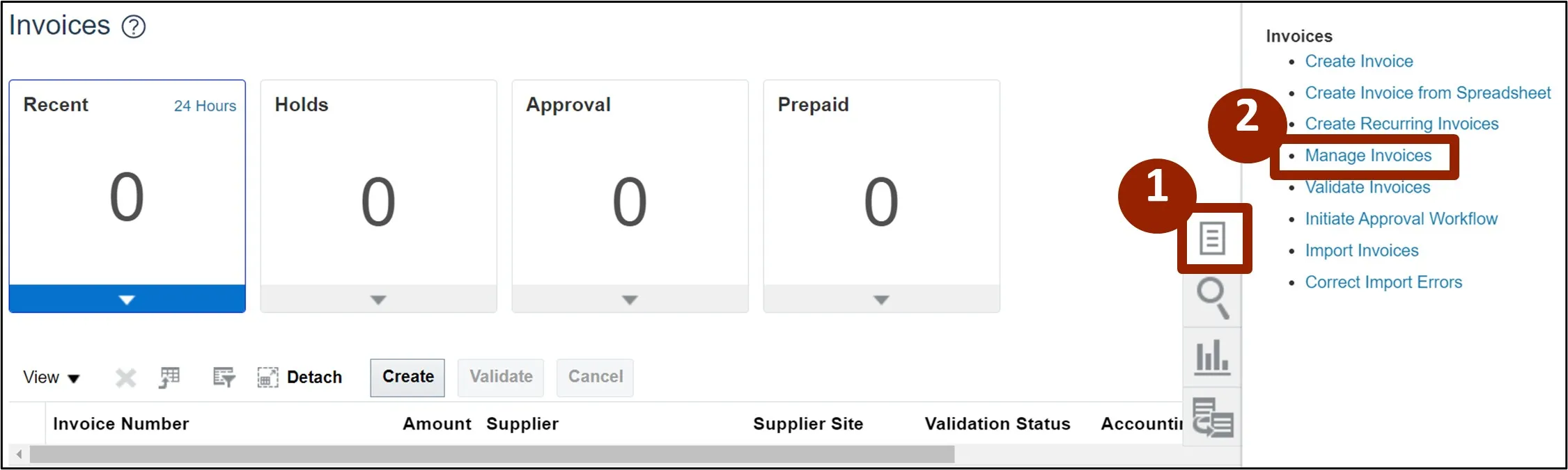 Navigate to the Invoices dashboard. (Home page > Payables tab > Invoice app):