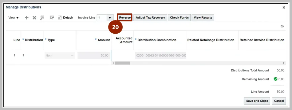 19. Click the Distribution button to update/correct the Distribution Combination.