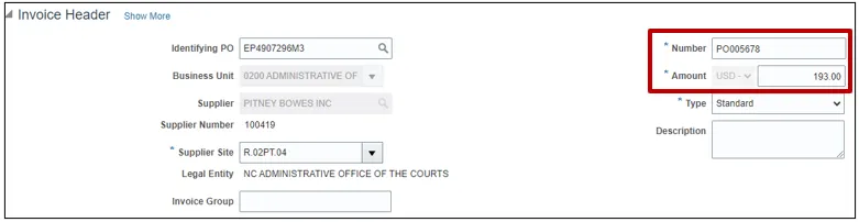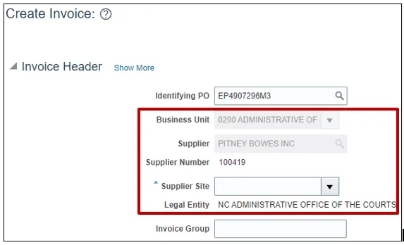 Step 4. The Create Invoice page opens. On the Invoice Header section, enter the appropriate PO number.