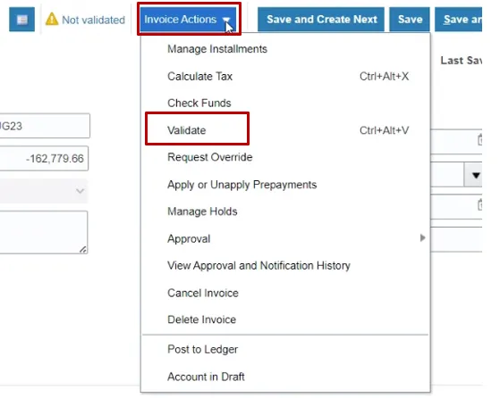 Step 12.    Now click on Invoice Actions and Validate the invoice.