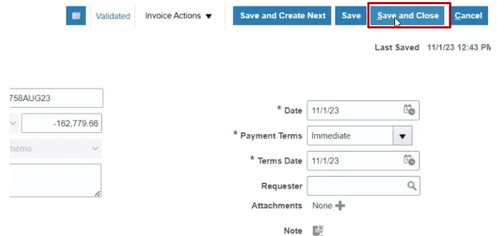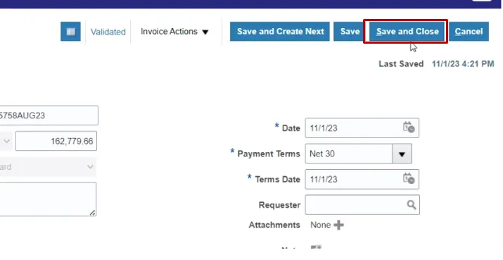 Step 15.    Once the approval is initiated, Save and Close this invoice.