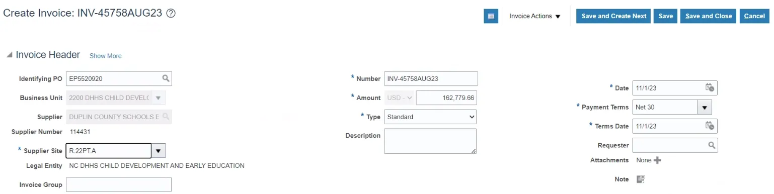 Step 2.    Create Invoice page is displayed. Enter the PO Number (it will automatically populate BU, Supplier, Supplier Number), Invoice Number, Invoice Amount (enter the original invoice amount) and Supplier Site (It must match the credit memo supplier site, or the credit memo won't post against the invoice, and you will duplicate payment to supplier).