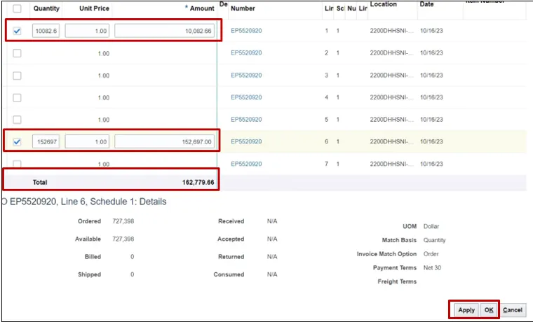 Step 4.    Now notice all the lines are listed. Select the line in the original invoice by clicking on the check box next to the lines. Now, change ONLY the quantity to match the original amount in the original invoice, this calculates the correct total amount.