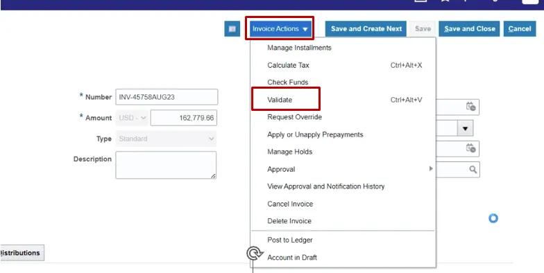 Step 5.    You will return to the create invoice page, click on Invoice Actions and Validate.