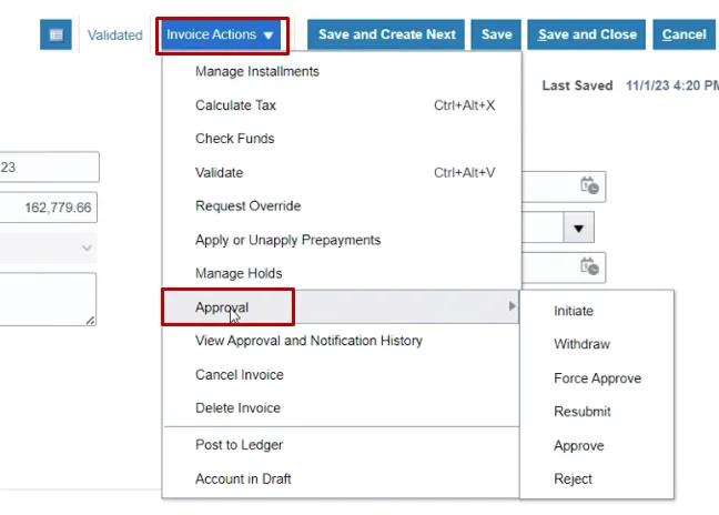 Step 6.    Once the invoice is validated, click on Invoice Actions and Initiate Approval.