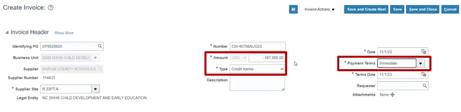 Step 4.    Create Invoice page is displayed. Enter the PO Number (it will automatically populate BU, Supplier, Supplier Number), Invoice Number, Invoice Amount (enter the original invoice amount in Negative), Type – Credit Memo, Payment Terms change it to – Immediate.