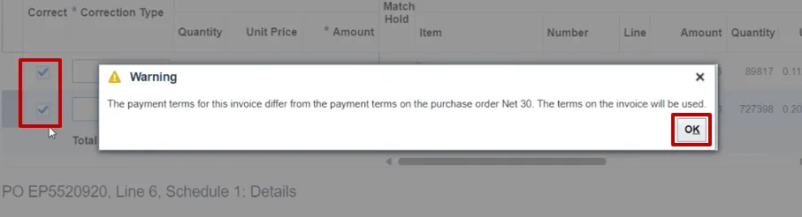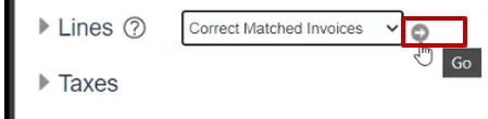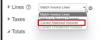 Step 5.    Go to Lines section and click on the dropdown and select Correct Matched Invoices.