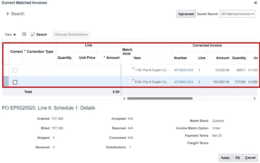 Step 7.    The Correct Matched Invoices page is displayed and the lines to be corrected are listed.