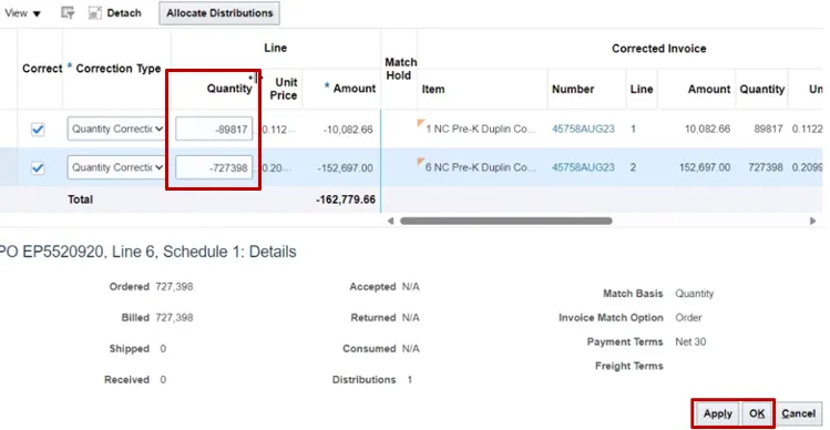 Step 9.    Once the lines are selected, click on the Correction Type drop down and select Quantity Correction.