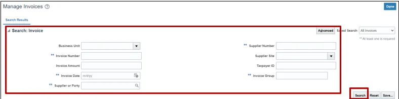 Step 4.     Manage Invoices page is displayed, enter the appropriate search criteria and click Search.