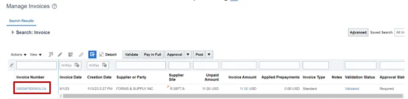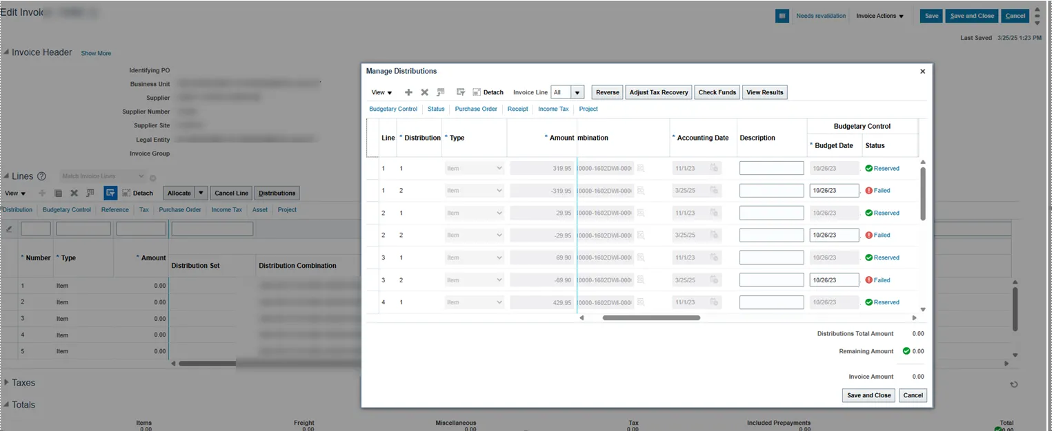 If the invoice does not cancel and displays “Needs Revalidation” it may be due to budget dates on the invoice distributions that are from a closed fiscal year.