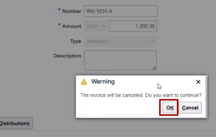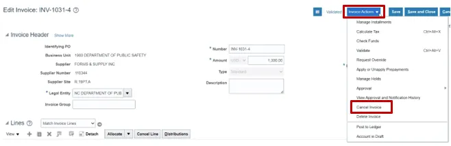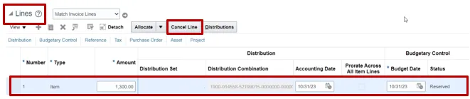 Note: Once you cancel a line, make sure to update the header amount to match the line amount and revalidate the invoice.