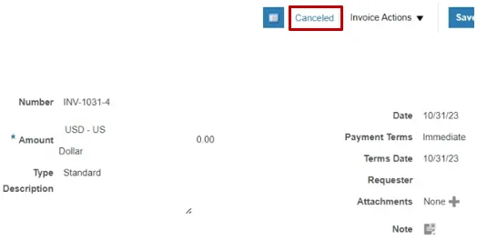 Step 6.    Click on Invoice Actions and select Cancel Invoice.