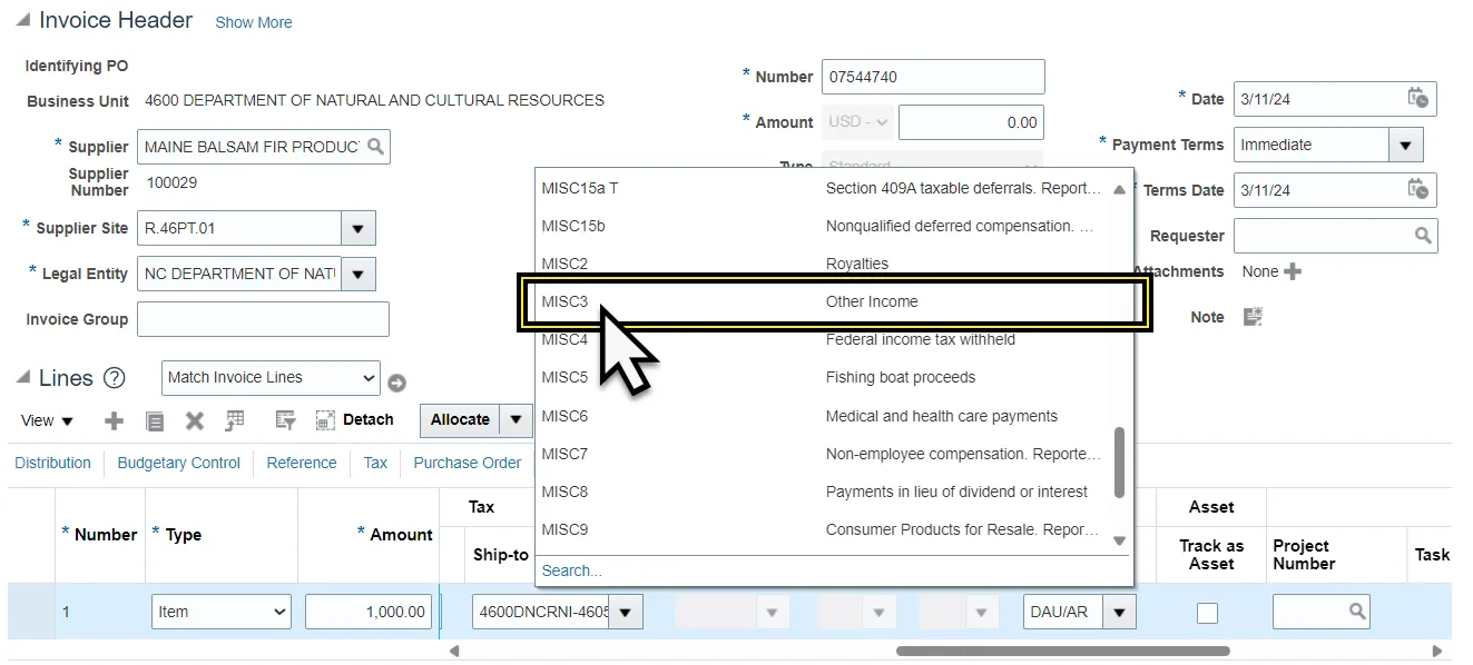 Step 5.    Select the appropriate income tax type. In this example, we selected MISC3.
