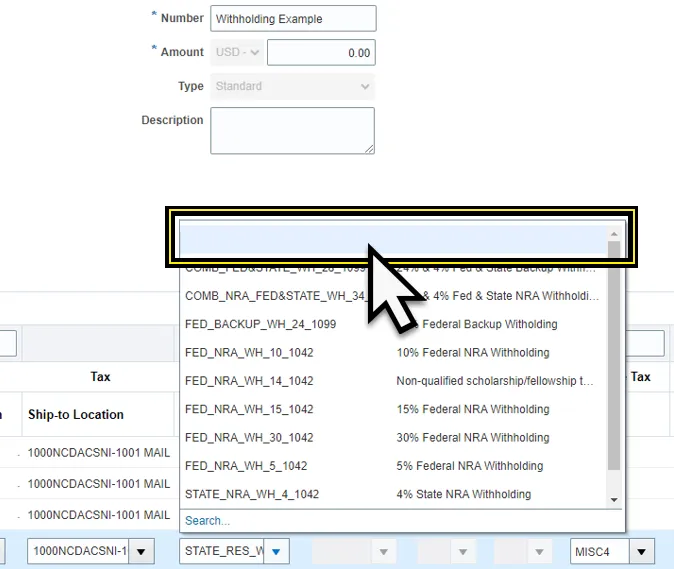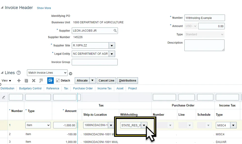 Step 8.    If the Income Tax is MISC4, remove the withholding description from the Withholding column if one is listed under the Tax Category. The invoice must be saved before the withholding description appears.