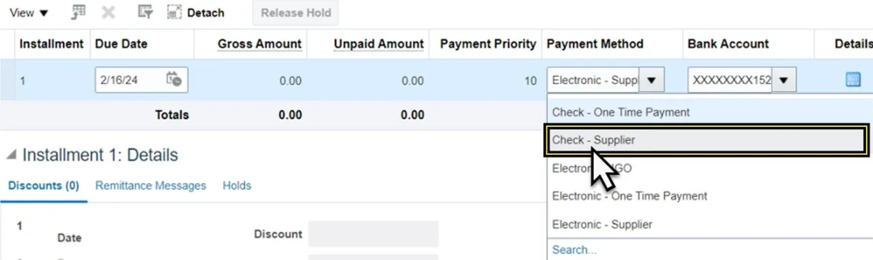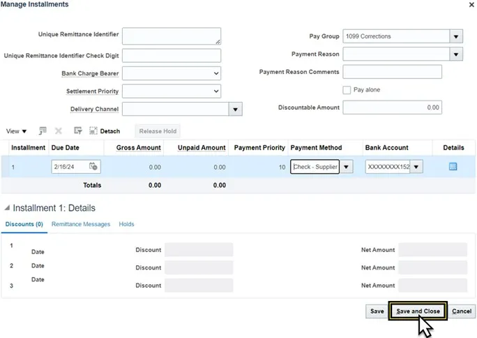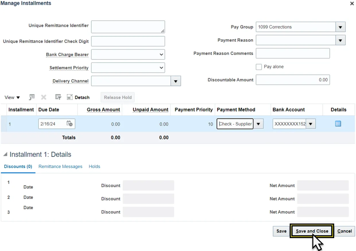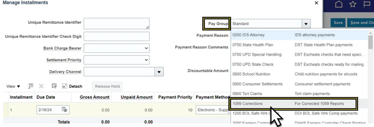 Step 16.    Make sure to click on Manage installments and select the 1099 corrections Pay Group and change the Payment method to Check-Supplier.