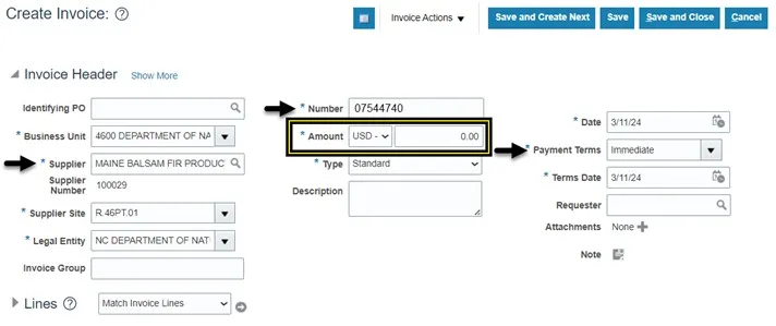 Step 2.    Enter the supplier information, Invoice Number, amount set to $0.00, and set the payment terms to Immediate on the create invoice header.