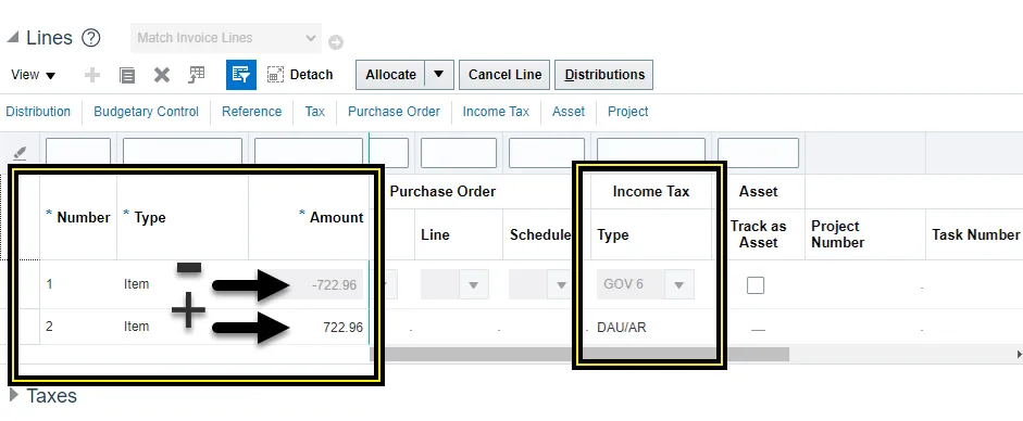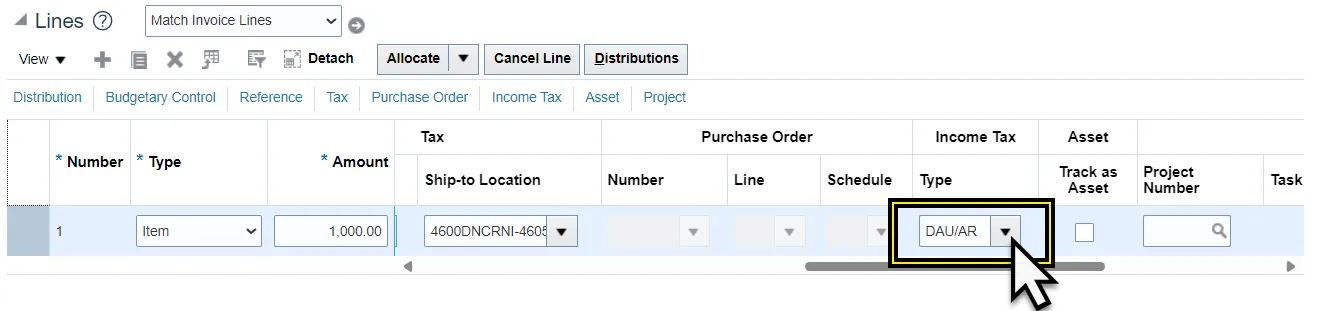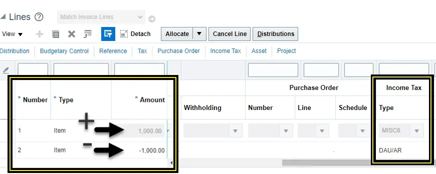 Step 4.    If the original 1099 amount needs to be increased, enter the additional amount into the positive line of the invoice with the 1099 code, and a negative line for the same amount, with the 1099 default DAU/AR in the Income Tax Type column.