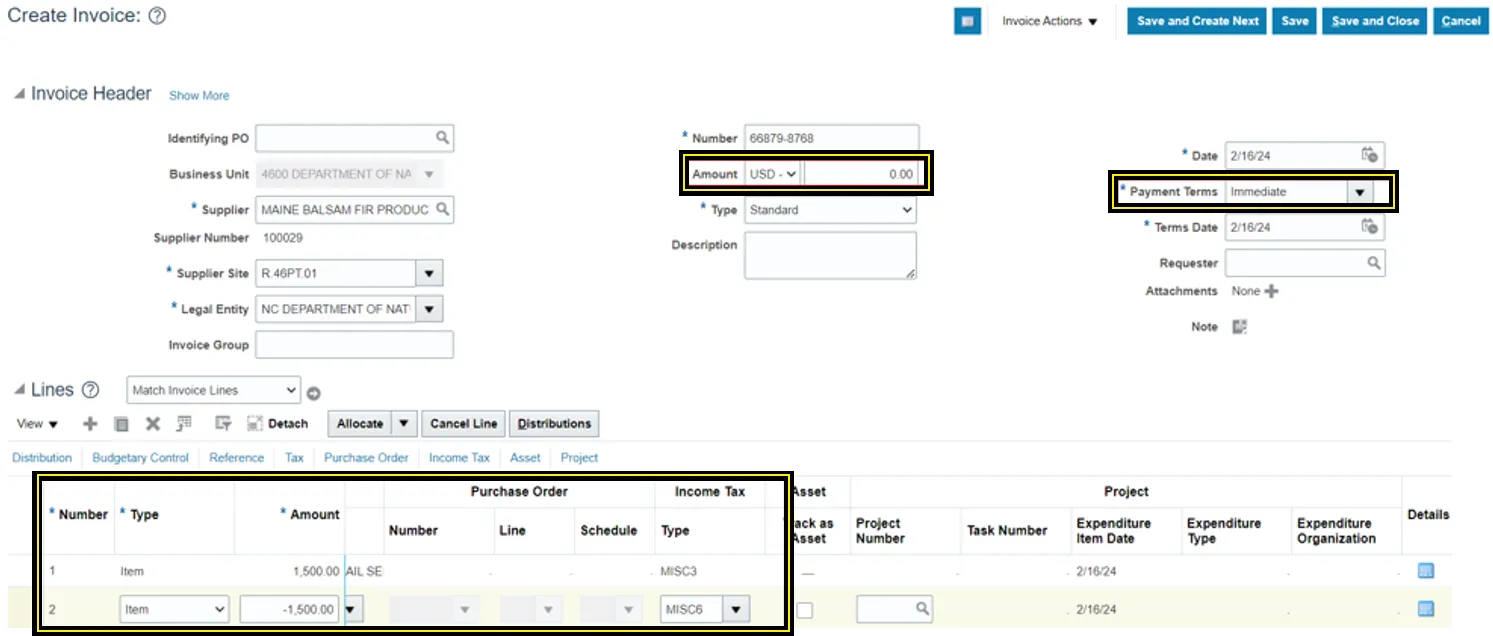 Step 13.    Enter the supplier information, Invoice Number, amount set to $0.00, and set the payment terms to Immediate on the create invoice header.