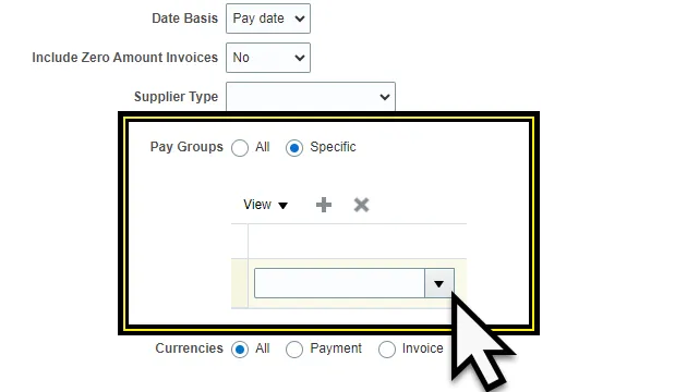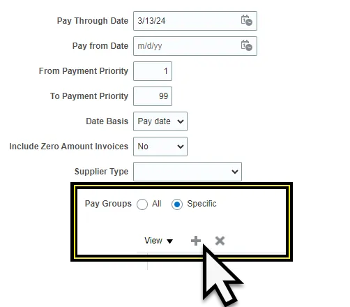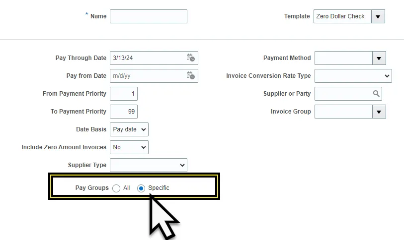 Step 8.    Click the radio button Specific next to the Pay Groups option.