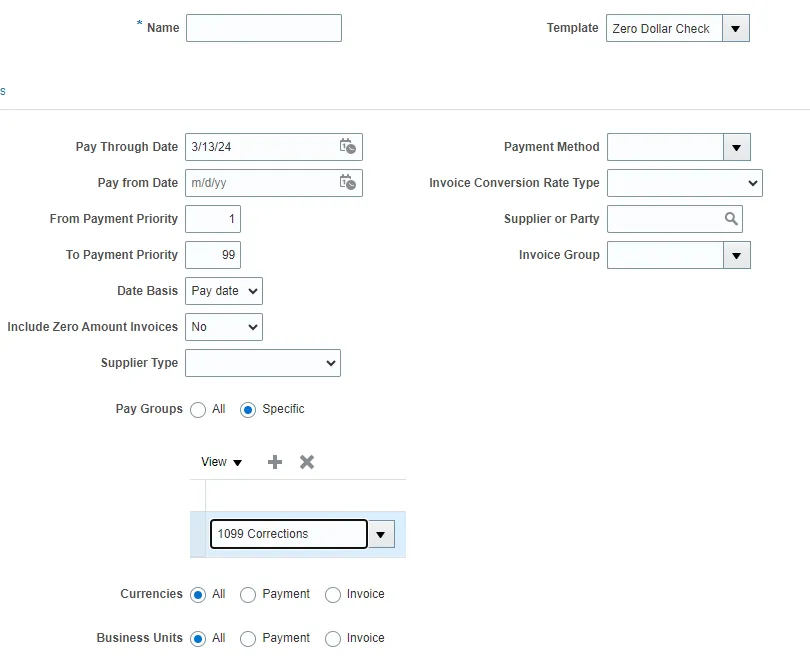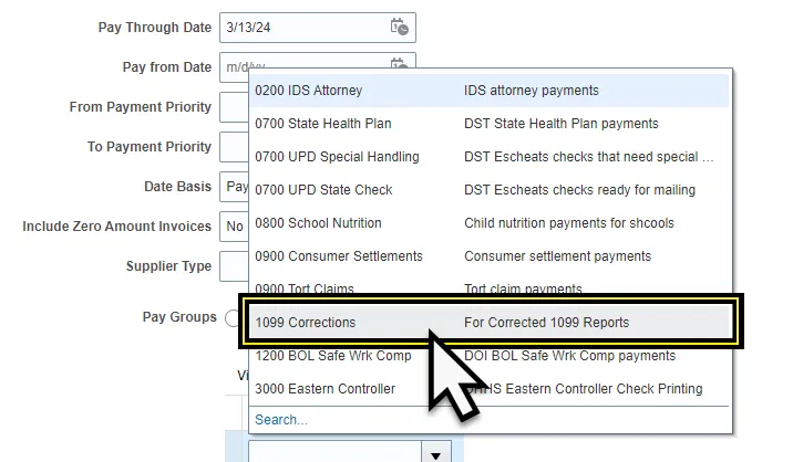 Step 11.    Select the 1099 Corrections from the drop-down menu in the Pay Groups option to pay only the $0 1099 Correction Invoices.