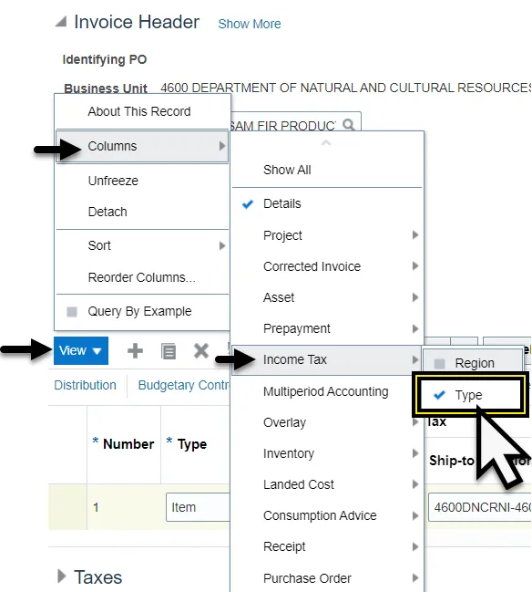 Note: If the Income Tax column is not visible. The Income Tax Type column can be added from the View option on the line menu; by selecting the Columns option and then Income Tax and Type.