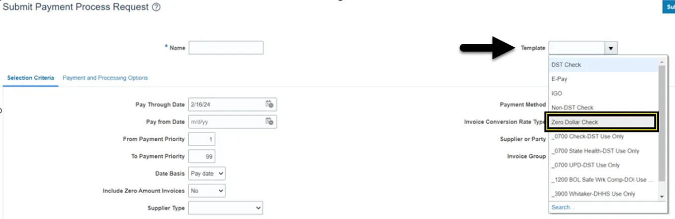 Step 6. Select the Template – Zero Dollar Check. Use this template to pay zero-dollar invoices without checks being printed.