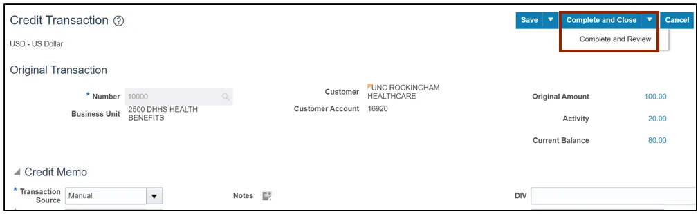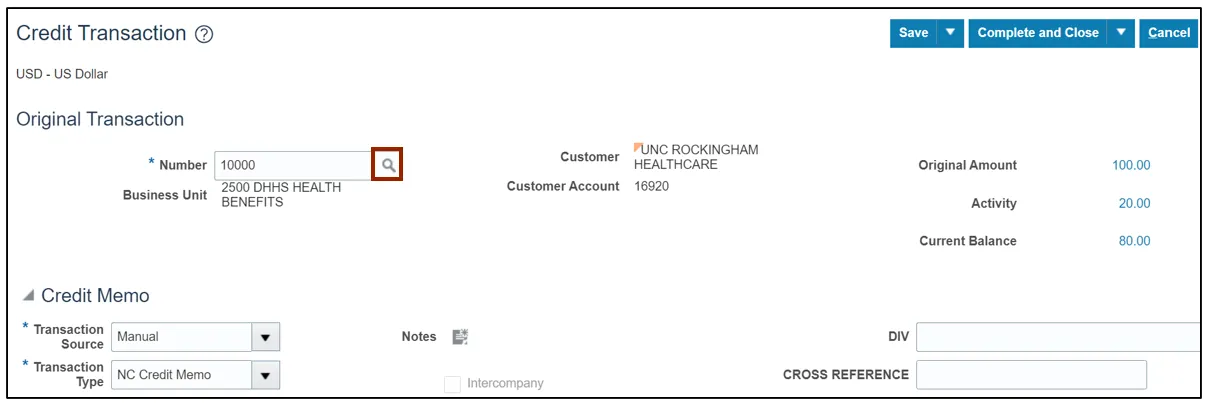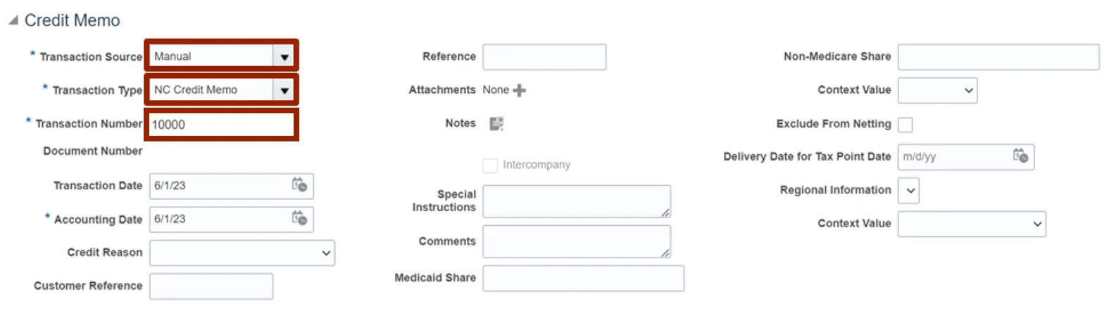 In this example, we choose: Manual for *Transaction Source, NC Credit Memo for *Transaction Type, and 10000 for *Transaction Number.