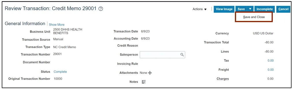 Step 12. Once the review is complete, click the Save drop-down choice list and then, click Save and Close button.