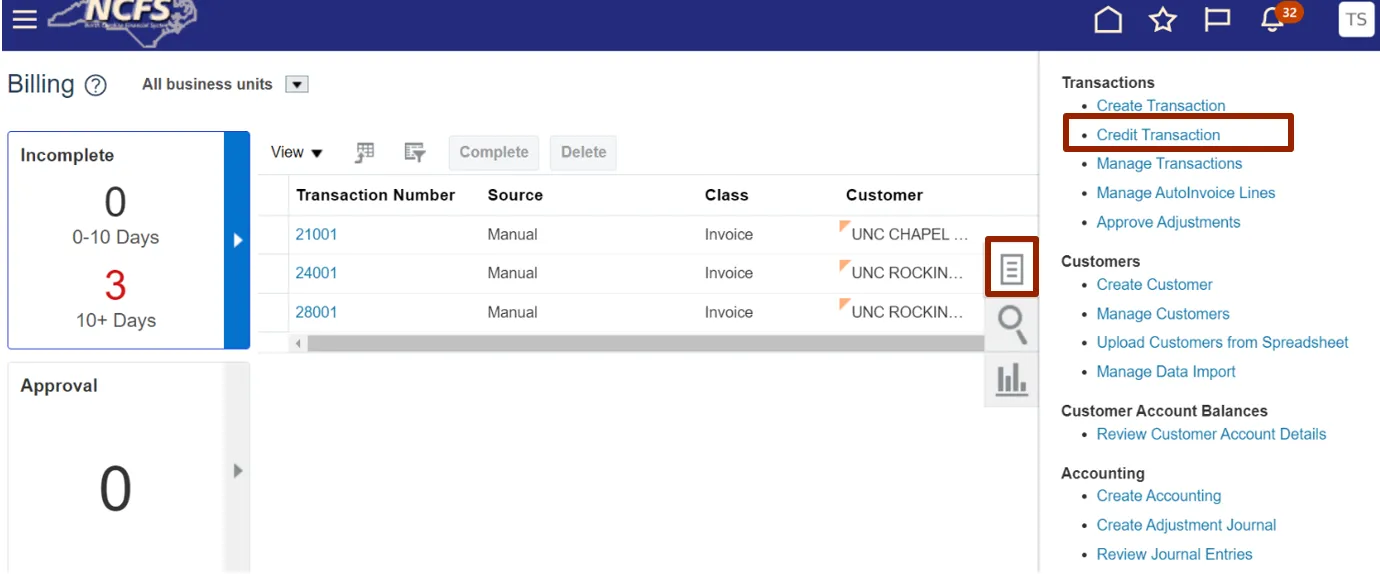 Step 3. On the Billing page, click the Tasks icon. Now, under Transactions section, click Credit Transaction.