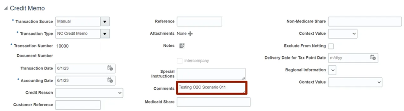 Step 8. Enter the reason for creating the credit memo in the Comments field.
