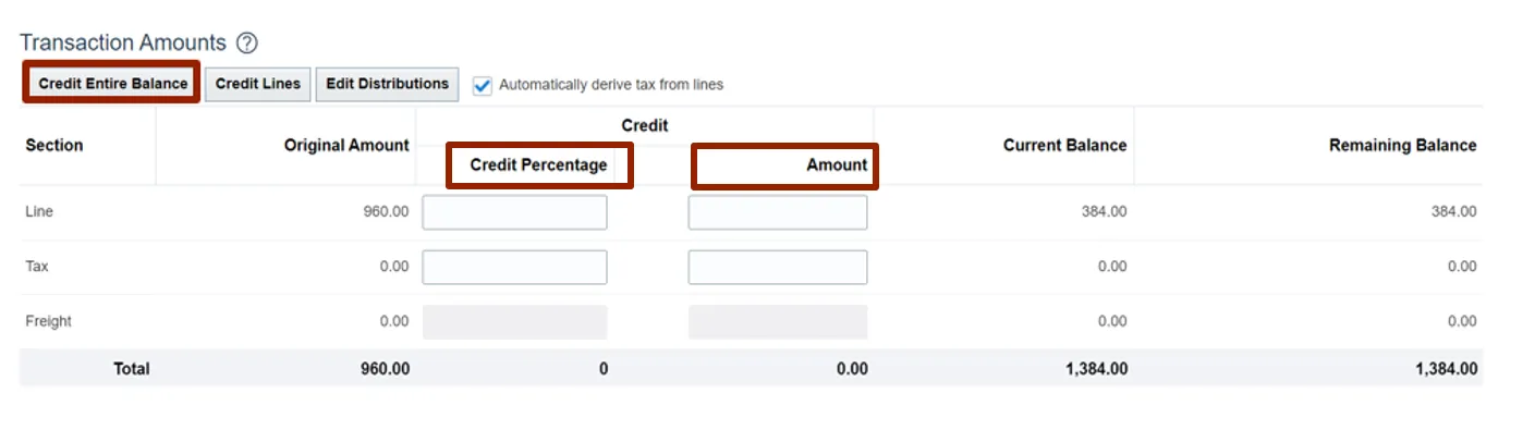 Note: You may choose to edit the Credit Percentage of the line to issue credit, or the Amount of the line to issue credit.