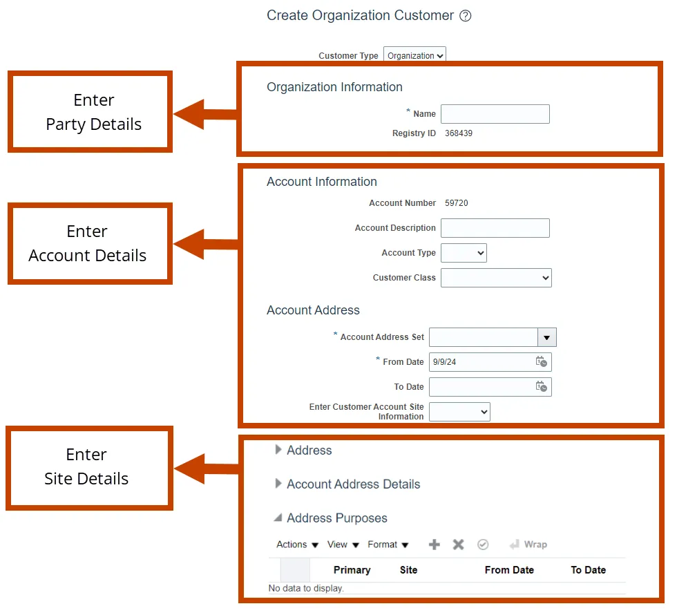 - Account Address: In the Account Address section, select the Account Address Set and Enter Customer Account Site Information.