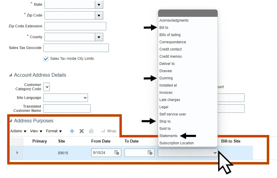 Step 10. Select the drop-down box in the Purpose column and Select: Bill-to, Ship-to, Dunning, and Statements.